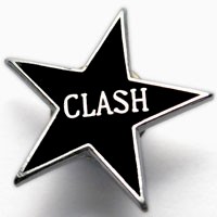 clash - metal badge - black 5 pointed star with silver "clash" text and silver edging badge -