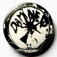 the damned - badge - damned text in black on "splatter/shatter" black and white style graphic background badge - 1.25" diameter - circular