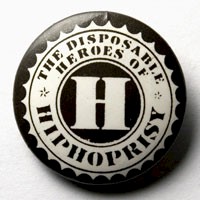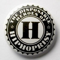 the disposable heroes of hiphoprisy black text on white background - white "H" logo badge - 1" diameter - circular