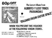 alberto y lost trios paranoias - flyer - 80p off latest album italians from outer space - the other album available through your local record store flyer -