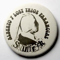 alberto y lost trios paranoias - badge - "snuff rock" in black on white "punk" style text - "alberto y lost trios paranoias" text in black as logo - with b&w profile portrait of guy with bag over his head - on white background - dented badge - 2.5"diameter - circular