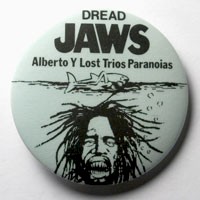 alberto y lost trios paranoias - badge - "dread jaws" in black text - "alberto y lost trios paranoias" in black text - with black cartoon rasta head and cartoon shark in water - all on light blue background badge - 2.5"diameter - circular