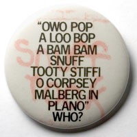 alberto y lost trios paranoias - badge - "owo pop a loo bop a bam bam snuff tooty stiffi o corpsey malberg in plano who?" in black tex, over pink "snuff rock" in "spray paint" style text - all on white background badge - 2.5"diameter - circular