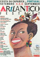 artlantico festa 87 - costa caparica portugal - 4th, 5th, 6th of september - various artists including billy bragg - the pogues, michelle shocked, communards, sweet honey in the rock, latin quarter & others - colour painting of woman's face with black, red & green text on white background - (has been folded) poster -