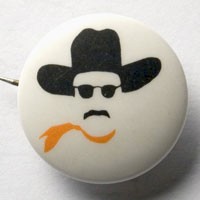 hank wangford - badge - graphic "cartoon" head image of hank (black and gold) on white background - non safety pin badge - 0.75" diameter - circular