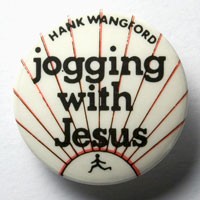 hank wangford - badge - jogging with jesus - black text on white background - with orange and black graphic of sun rays & cartoon figure running badge - 1" diameter - circular