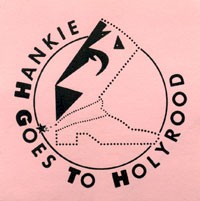 hank wangford - badge - designed by caramel crunch - hankie goes to holyrood - black text on white background - with graphic boot & hank face logo badge - 1" diameter - circular