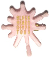 ian dury - badge - BARNEY BUBBLE DESIGNS - block heads d-i-y 79 tour - pink plastic "splash" with gold text promo item -