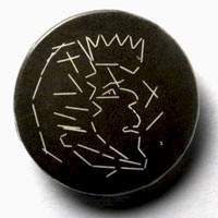 ian dury - badge - BARNEY BUBBLE DESIGNS - white line drawing of face on black background - as on "hankie pantie christmas tour" promo booklet badge - 1" diameter - circular