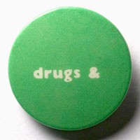 ian dury - badge - BARNEY BUBBLE DESIGNS - "drugs &" text in white on green background badge - 1" diameter - circular