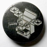 ian dury - badge - tommy the talking tool box - barney bubbles design - part of "do it yourself" album cover - tommy in white text with b&w "toolbox" as face graphic on black background badge - 1.25" diameter - circular