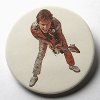 wreckless eric - badge - colour portrait of eric wearing "spotted" glam rock suit with rickenbacker guitar on white background badge - 2.25" diameter - circular