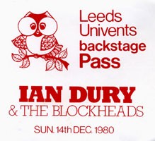 ian dury & the blockheads - tour pass - stick on - backstage pass - leeds univents - ultimate pass - with owl logo - green on white tour pass -