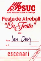 ian dury - tour pass - stick on - festa de treball - paetit socialista unificat de catalunya - escenari divendres - 1981 tour pass -