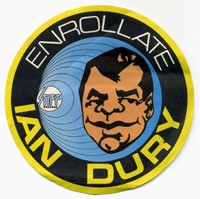 ian dury - sticker - "ian dury" yellow text on black - "enrollate" white text on black - with comic head image - stiff records logo (blue on white) - predominantly blue yellow & black sticker - 4.75" diameter - circular