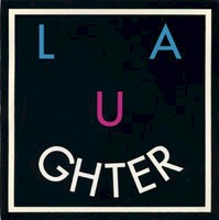 ian dury - sticker - "LAUGHTER" in blockhead logo style to emulate smiling face - blue pink and white letters on black background sticker - 5" square