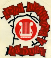 ian dury - window sticker - "lord upminster ian dury" in angular red and dark red text as part of caricature profile of dury - designed peabody logo in red - 6" diameter circular clear sticker within rectangular base - BARNEY BUBBLE DESIGNS window sticker -