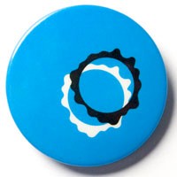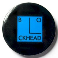ian dury - badge - blockhead clockface graphic logo with blue text out of blue square on blue background - maybe barney bubbles design badge - 1.25" diameter - circular