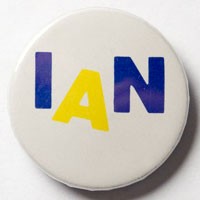 ian dury - badge - "ian" in text - i & n in blue text - a in yellow text - on white background - maybe barney bubbles design badge - 1" diameter - circular