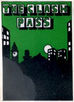 the clash pass - tour pass - laminated - green black and white - cartoon cityscape at night - poor condition tour pass -