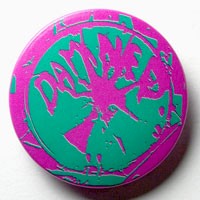 the damned - badge - damned text in purple on "splatter/shatter" purple and green style graphic background badge - 1.25" diameter - circular