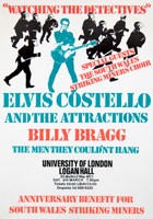 watching the detectives - elvis costello and the attractions - billy bragg, the men they couldn't hang - anniversary benefit for south wales striking miners - university of london logan hall wc2 - sat 9th march - green red & black on white background poster -