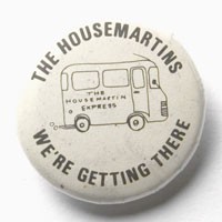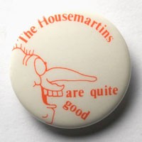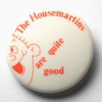 the housemartins are quite good orange cartoon character's face with tongue out on left of frame on white background badge - 1" diameter - circular