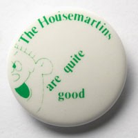 the housemartins are quite good green cartoon character's face with tongue out on left of frame on white background badge - 1" diameter - circular