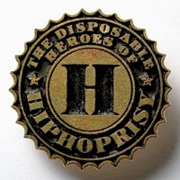 the disposable heroes of hiphoprisy black text on white background - white "H" logo badge - 1" diameter - circular