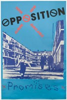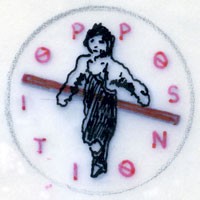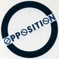 opposition - original artwork for rubber stamp - designed by caramel crunch - circular 3.5" diameter - black ring around circumference with white center and "opposition" in black text across at 45 degree angle original artwork -