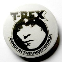 t rex - badge - dandy in the underworld - black text on white background & t rex logo - with half tone portrait of marc boland badge - 1.25" diameter - circular