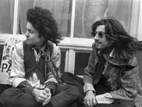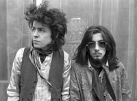 t rex - marc bolan & steve peregrin Took - standing mid shot - hard lighting - tree in background b/w walkerprint -