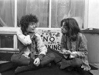t rex - marc bolan & steve peregrin took - sitting cross legged - in front of no parking sign - in conversation - outside shop on the street original b/w print -