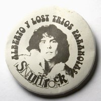 alberto y lost trios paranoias - badge - "snuff rock" in black on white "punk" style text - "alberto y lost trios paranoias" text in black as logo - with b&w head & shoulders portrait of guy - on white background - poor condition badge - 2.5"diameter - circular