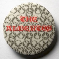 alberto y lost trios paranoias - badge - "the albertos" in red text - with grey linked metal rings graphic - all on white background badge - 1.25" diameter - circular