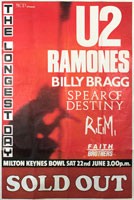 the longest day - milton keynes bowl - sat 22nd june - 3.00pm - sold out - mcp presents - u2 - ramones - billy bragg - spear of destiny - rem - faith brothers - silhouette of "bono"? on red affected background (has been folded) poster -