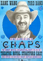 hank wangford band - chaps, the cowboy musical - theatre royal stratford east - 16th may to 15th june 8.00pm - b&w of pic of hank in dark blue circle - black text on light blue background poster -