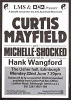 hank wangford - curtis mayfield and michelle shocked compared by hank wangford - a benefit concert for the anti-apartheid movement - the usher hall edinburgh - Monday 22nd june 7.30 pm - white text on black background poster -
