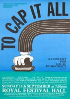 hank wangford - to cap it all - a concert for local democracy - sunday 16th september 7.00pm - royal festival hall - a evening of music & comedy - various guest performers - cartoon arm in pinstripe suit pushing down a bowler hat poster -