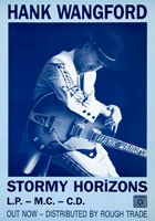 hank wangford - stormy horizons - lp mc cd - out now - distributed by rough trade - portrait of hank in a nudie suit on a stool, looking down cradling a gretsch guitar - sky blue background, blue tinted monochrome photograph poster -