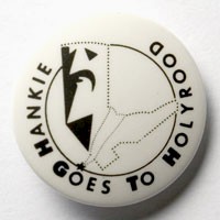 hank wangford - badge - designed by caramel crunch - hankie goes to holyrood - black text on white background - with graphic boot & hank face logo badge - 1" diameter - circular