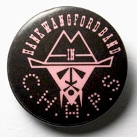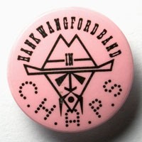 hank wangford - badge - hank wangford band in c.h.a.p.s. - pink text on black background - with angular head and hat graphic badge - 1" diameter - circular