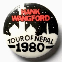 hank wangford - badge - hank wangford (in red) tour of nepal 1980 (in black) text - on black and white graphic of buildings in snow background badge - 1" diameter - circular