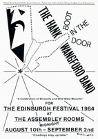 the hank wangford band - sticker - boot in the door - for the edinburgh festival 1984 at the assembly rooms - aug 10th to sep 2nd - black on white - designed by caramel crunch sticker -