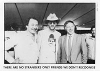 A + B (double sided) hank wangford - promo postcard - double sided - "there are no strangers only friends we don’t recognise" as black text - with picture of hank with ken livingstone & arthur scargill - other side "but… _ we'll always recogise you, sincerely hank wangford and his dear friend(s) - maybe designed by caramel crunch promo postcard -