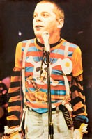 ian dury - no text, colour image only - wearing fried egg braces and skull & cross bones horizontal striped t shirt