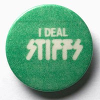 stiff - badge - I deal stiffs - white text on green background badge - 1" diameter - circular
