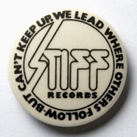 stiff - badge - we lead where others follow but can't keep up plus stiff records logo - black text on white background badge - 1.25" diameter - circular