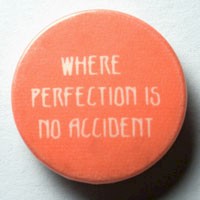 stiff - badge - where perfection is no accident - white text on peach background - barney bubbles badge - 1" diameter - circular