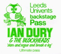ian dury & the blockheads - tour pass - stick on - backstage pass - leeds univents - ultimate pass - with owl logo - green on white tour pass -